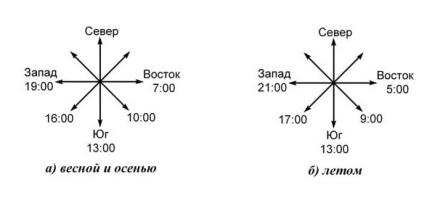 Определить стороны горизонта можно по положению солнца, как показано на рисунке. Данный способ применим, при условии, что известно приблизительное время. Его можно определить по тени — самая короткая тень от предметов бывает в 13.00. Так как солнце в полдень всегда находится на юге, то направление тени от вертикальных объектов в это время указывает на север. Чтобы определить время при отсутствии часов нужно определить самую короткую тень, измеряя ее на земле через равные промежутки времени (около 15 мин).