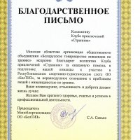 Минская городская организация общественного объединения "Белорусское товарищество инвалидов по зрению" искренне благодарит коллектив Клуба приключений "Странник" за оказанную помощь в подготовке нашей команды к участию в Республиканском спортивно-туристическом слете ОО "БелТИЗ", за неравнодушное отношение к проблемам людей с инвалидностью по зрению.