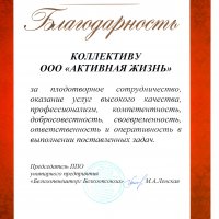 Выражаем благодарность коллективу ООО "Активная жизнь" за плодотворное сотрудничество, оказание услуг высокого качества, профессионализм, компетентность, ответственность и оперативность в выполнении поставленных задач.